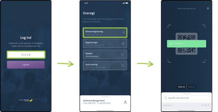 Hvis kolleger eller samarbejdspartnere foretager ankomstregistreringen, skal du give dem deres mobilnøgle, så de kan logge ind i CM Exhibition-appen.