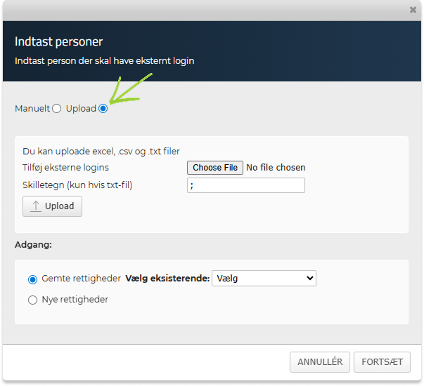 - Vælg hvilken adgang disse logins skal have. Du kan oprette nye rettigheder eller bruge en gemt adgangsprofil.