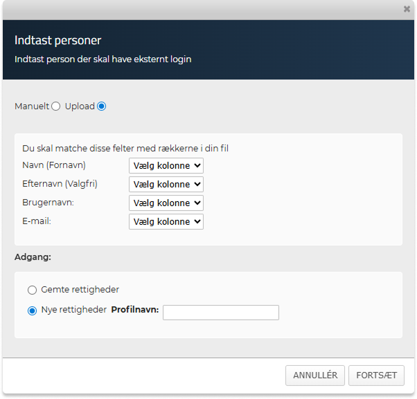 Du kan også oprette flere eksterne logins på én gang ved at uploade en Excel-, CSV- eller .txt-fil, som indeholder navn, brugernavn og e-mailadresse.