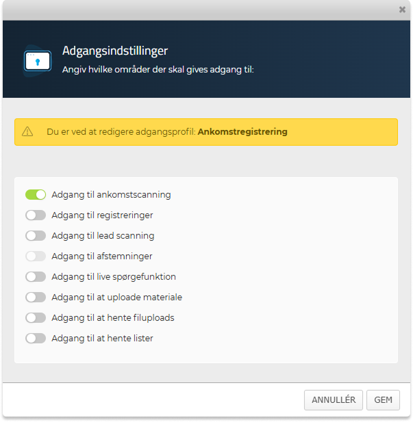 - Gennemgå adgangsprofilen. Hvis nødvendigt, kan du redigere rettighederne, før du gemmer. Bemærk: ændringer gælder for hele adgangsprofilen og påvirker altså alle eksterne logins, der bruger den.