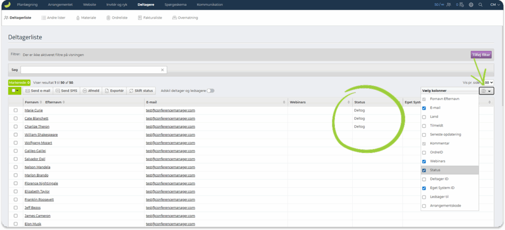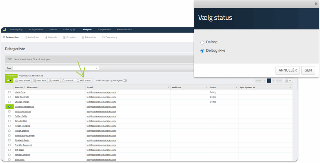 Hvis du ønsker at give deltagere status Deltog ikke — eller ændre en eksisterende status — så markér dem på deltagerlisten og klik Skift status og vælg en ny status.