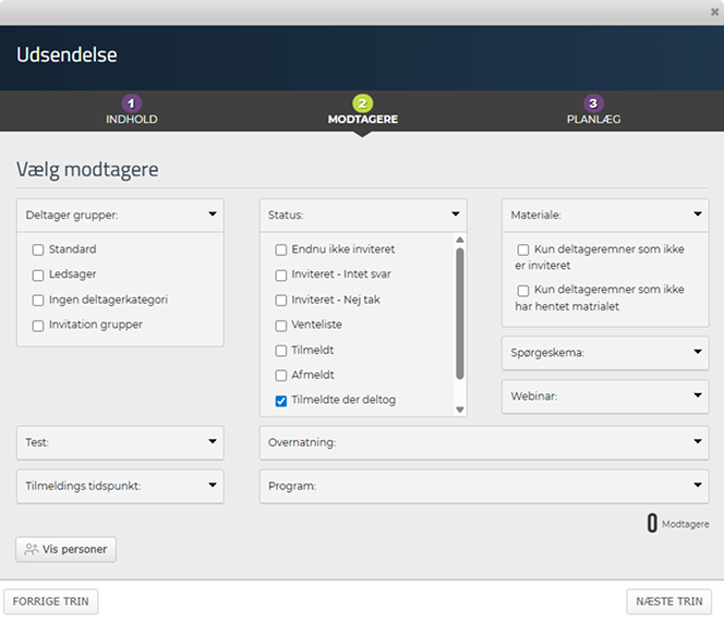 - I vinduet Vælg modtagere, kan du filtrere dine modtagere: