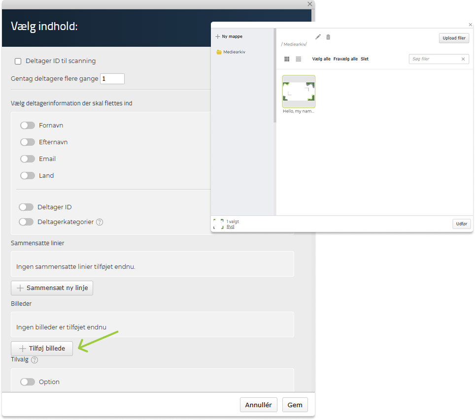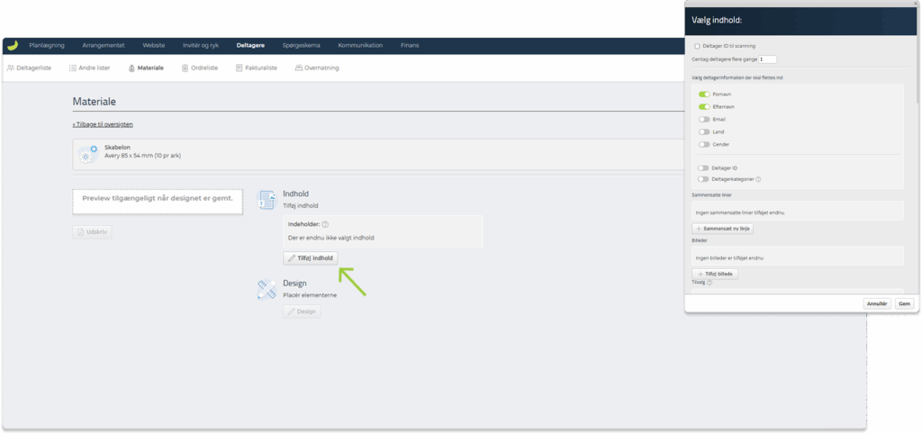 - I vinduet Vælg indhold kan du vælge, hvilke oplysninger der skal fremgå på navneskiltet.