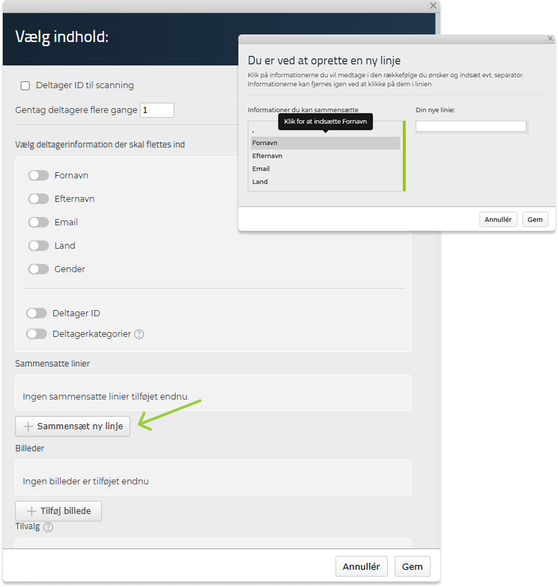 Klik på Sammensæt ny linje for at kombinere felter som fornavn og efternavn.