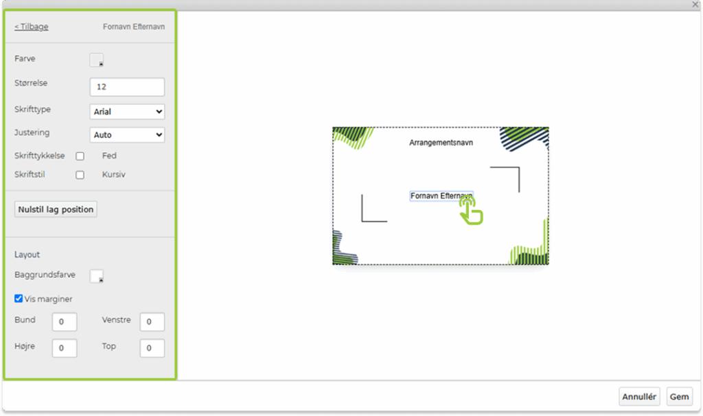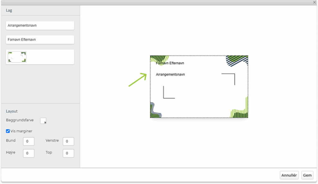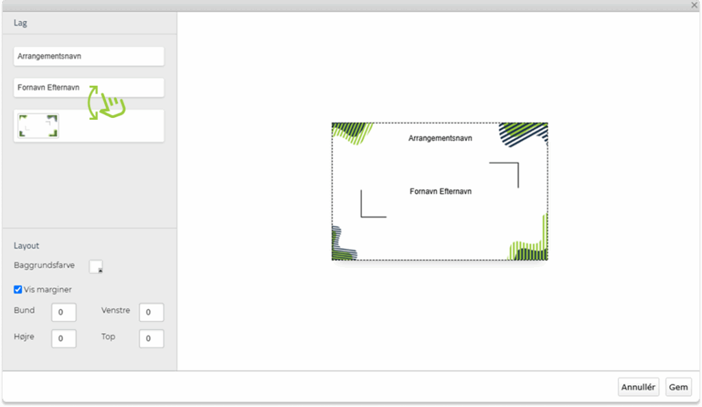 - Træk og placér hvert element frit på navneskiltets lærred.
