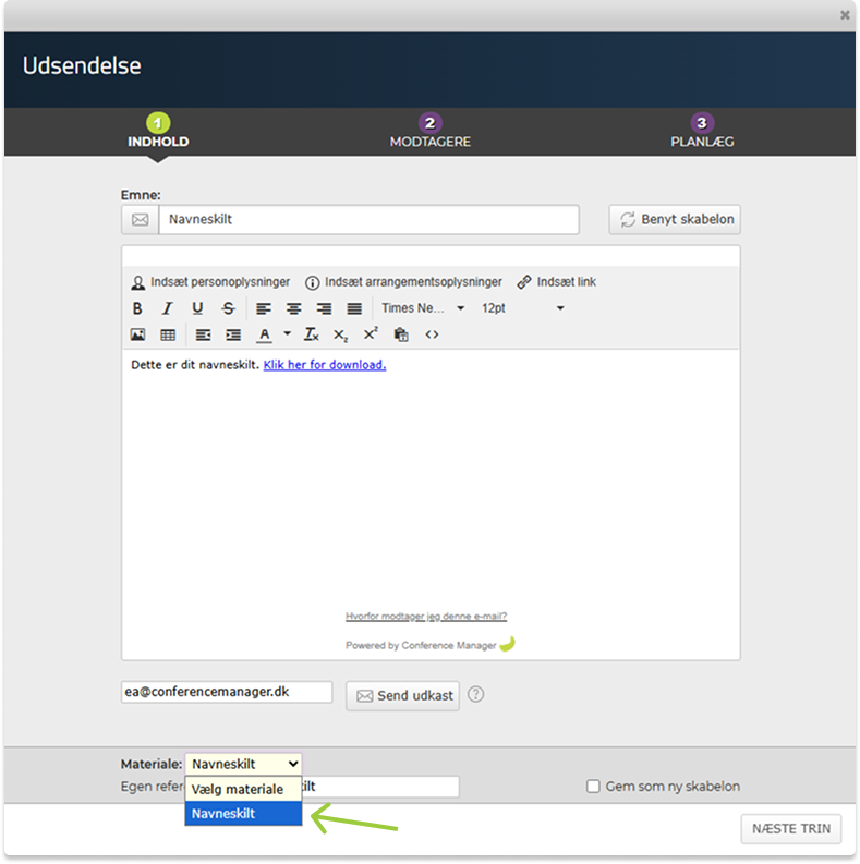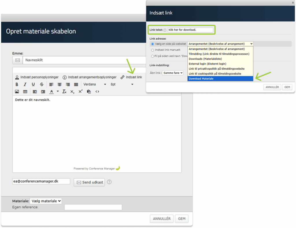 - Indtast Linktekst, som skal vises i e-mailen (fx Klik her for at hente dit navneskilt).