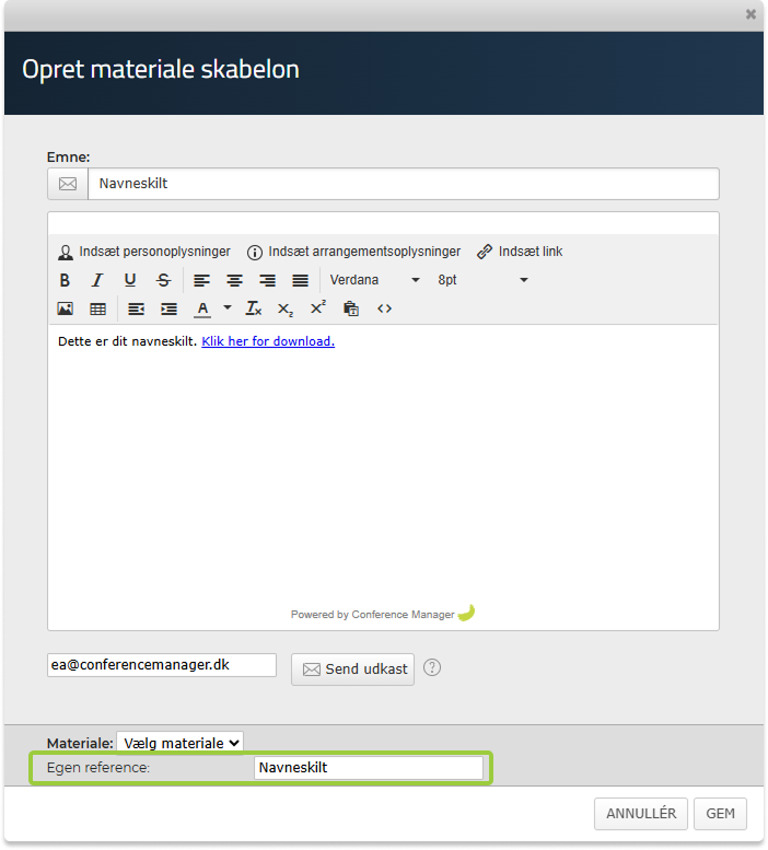 - Udfyld feltet Egen reference – dette er blot navn på mailskabelonen til intern brug.