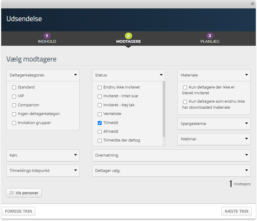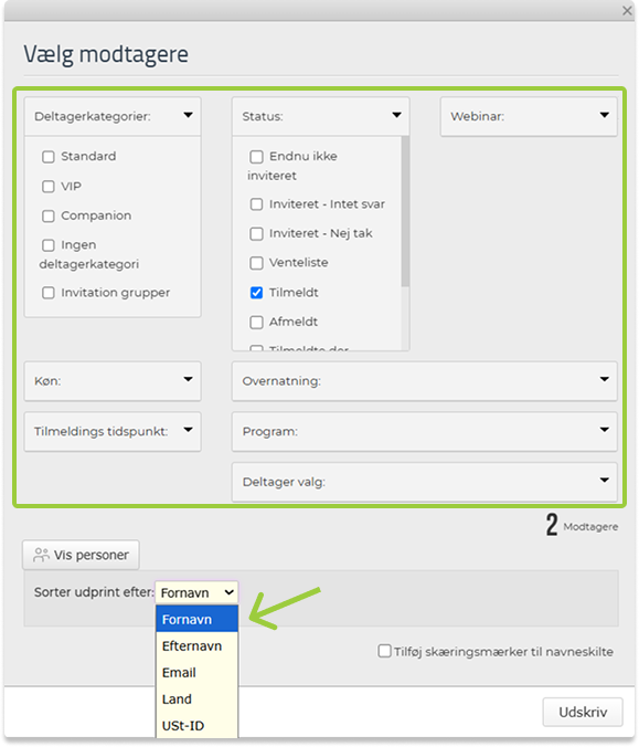 - Valgfrit: Vælg fx Deltagerkategorier eller Tilmeldingstidspunkt.