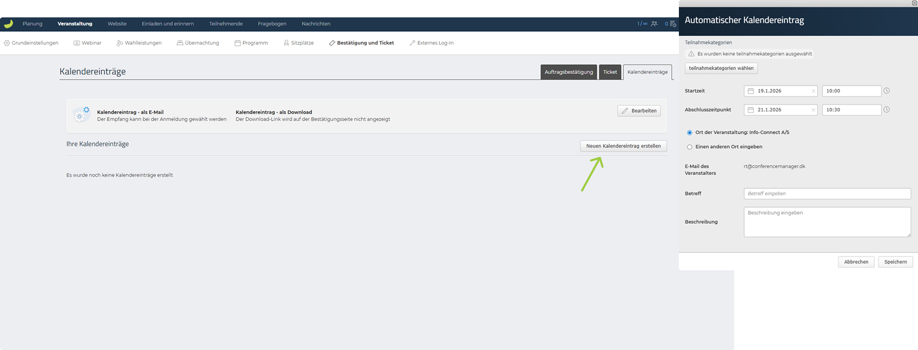 Nachdem Sie die Einstellungen gespeichert haben, müssen Sie den eigentlichen Kalendereintrag erstellen: