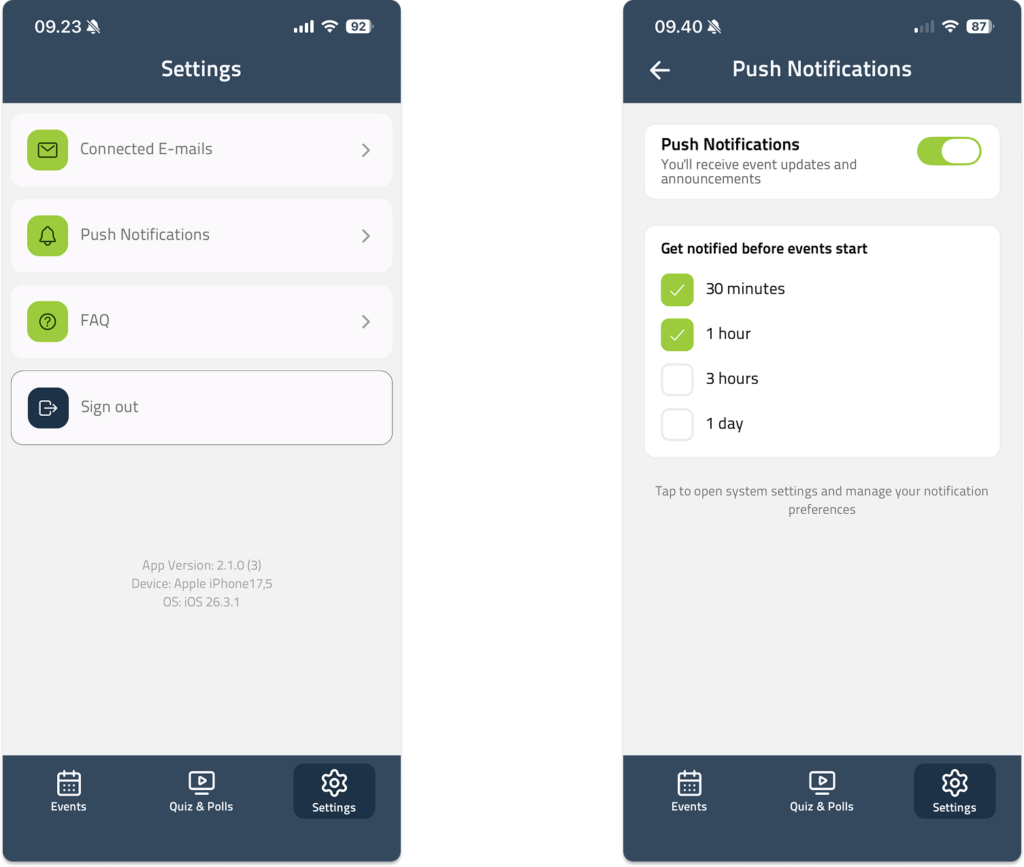 Wenn die Funktion aktiviert ist, kann die App Erinnerungen senden, bevor eine Veranstaltung beginnt. So wird sichergestellt, dass Teilnehmer keine wichtigen Sessions oder Aktivitäten verpassen.