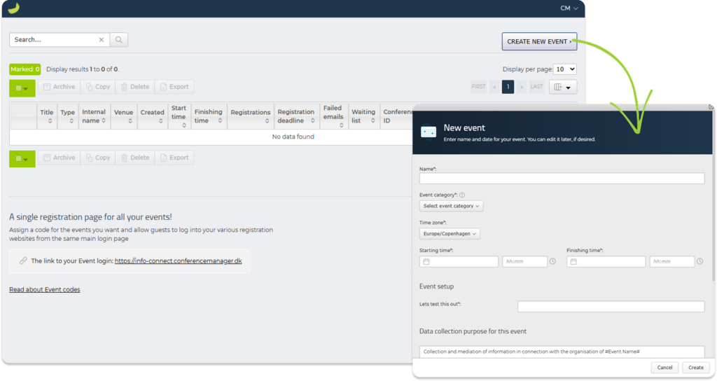After logging in, you can create your first event. Click on Create new event and then fill out the details for your event.