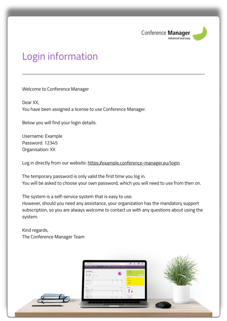 Once you have been registered for Conference Manager, you will receive a welcome email with your login details.