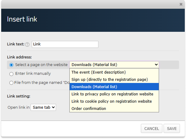 You can also choose to link to the download page and not directly to one specific file. This is useful if you have several files and want participants to access them all from one page. To do this, choose Select a page on the website under Link address and then choose Downloads (material list) in the drop-down menu.