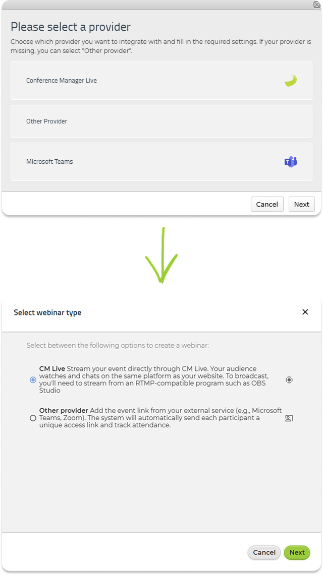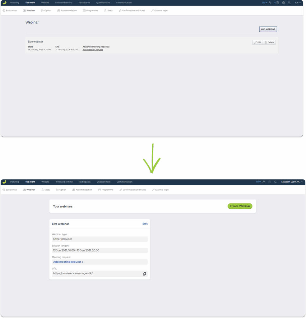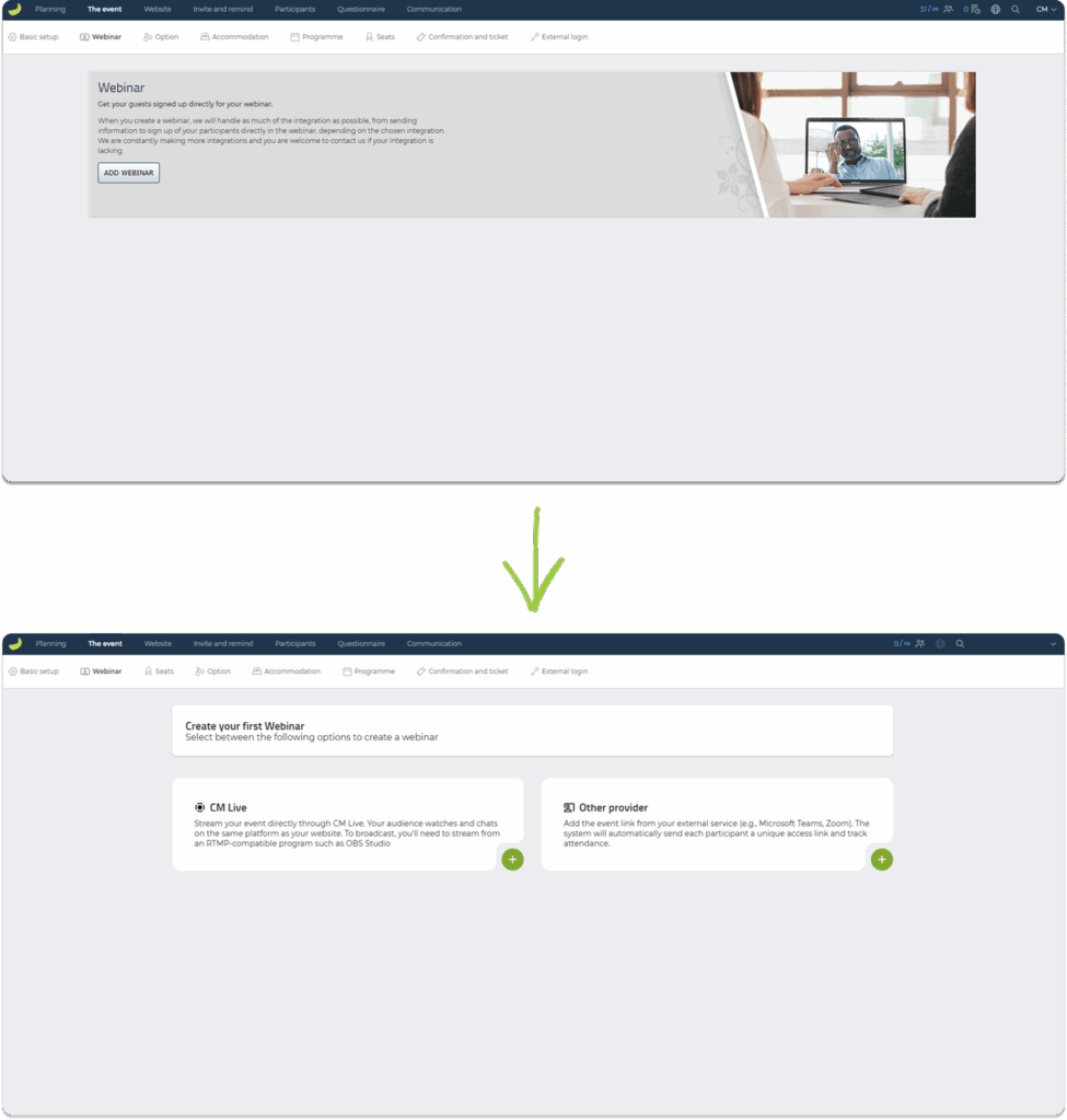 The Webinar tab now has a new and more modern design. The purpose of this update is to make it easier to work with two webinar options: CM Live and Other provider. The underlying functionality remains unchanged — the interface simply presents these options in a clearer and more intuitive structure.