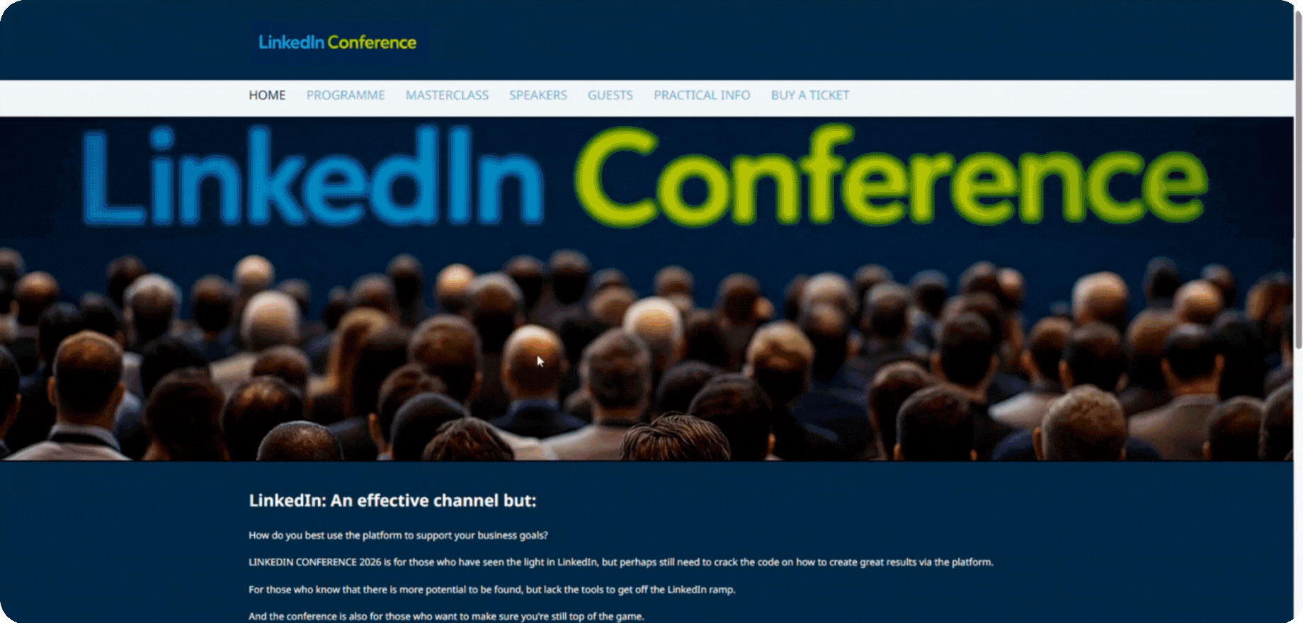 Navigeringsmenyn på vänster sida hålls synlig för att ge tillgång till viktiga sektioner, medan en tydlig call-to-action-knapp på startsidan länkar direkt till registreringssidan. En särskild programsida har också skapats, där programmet automatiskt hämtas från evenemangsinställningarna i Conference Manager och visas på webbplatsen.